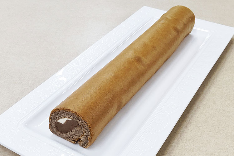 ふわふわ食感の生地で、チョコレートとミルク風味の2種類のクリームを巻き上げたロールケーキです。
