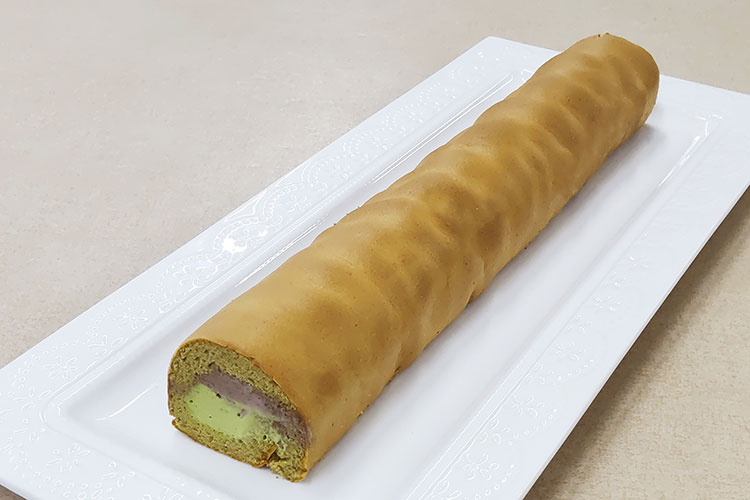 ふわふわ食感の生地で、抹茶とチョコレート風味の2種類のクリームを巻き上げたロールケーキです。