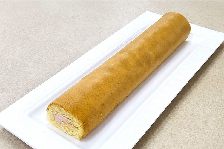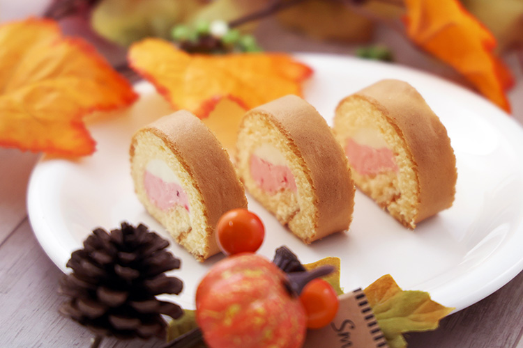 ふわふわ食感の生地で、いちごとミルク風味の2種類のクリームを巻き上げたロールケーキです。