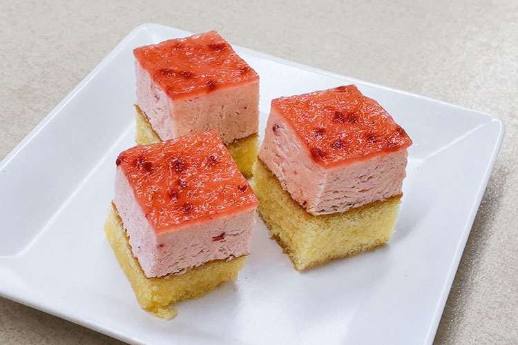 甘酸っぱいムースにラズベリージャムをトッピングした、色彩あざやかなムースケーキです。