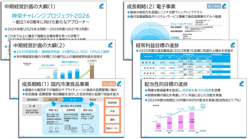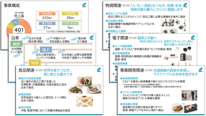 本説明会では、赤澤社長より、会社概要として当社グループの事業の成り立ちや各事業の紹介、昨年4月にスタートした中期経営計画とその進捗などの詳しい説明を行っています。